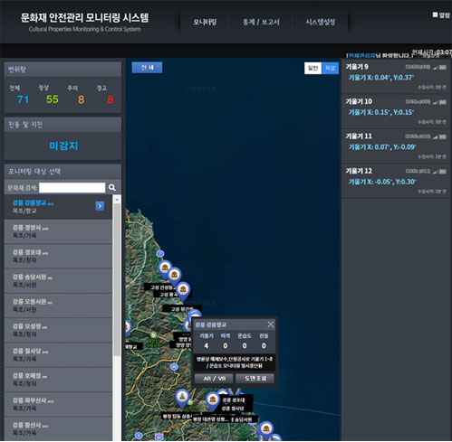 문화재 안전관리 모니터링시스템 - 강원도 46개 국소 문화재 변위 안전관리 모니터링시스템 적용(2018년 9월) - 강원도 25개 국소 문화재 변위 안전관리 모니터링시스템 적용(2019년 11월) - 강원 18개 국소/경남 1개 국소 문화재 안전관리 모니터링시스템 예정(2020년 4월) ◾ 시설물 안전관리 모니터링시스템 - 대전 초고층건물 안전관리 모니터링시스템 적용(2019년 7월) - 강원도 32개 구조물 고장예지 및 건전성 관리시스템(2020년 2월)